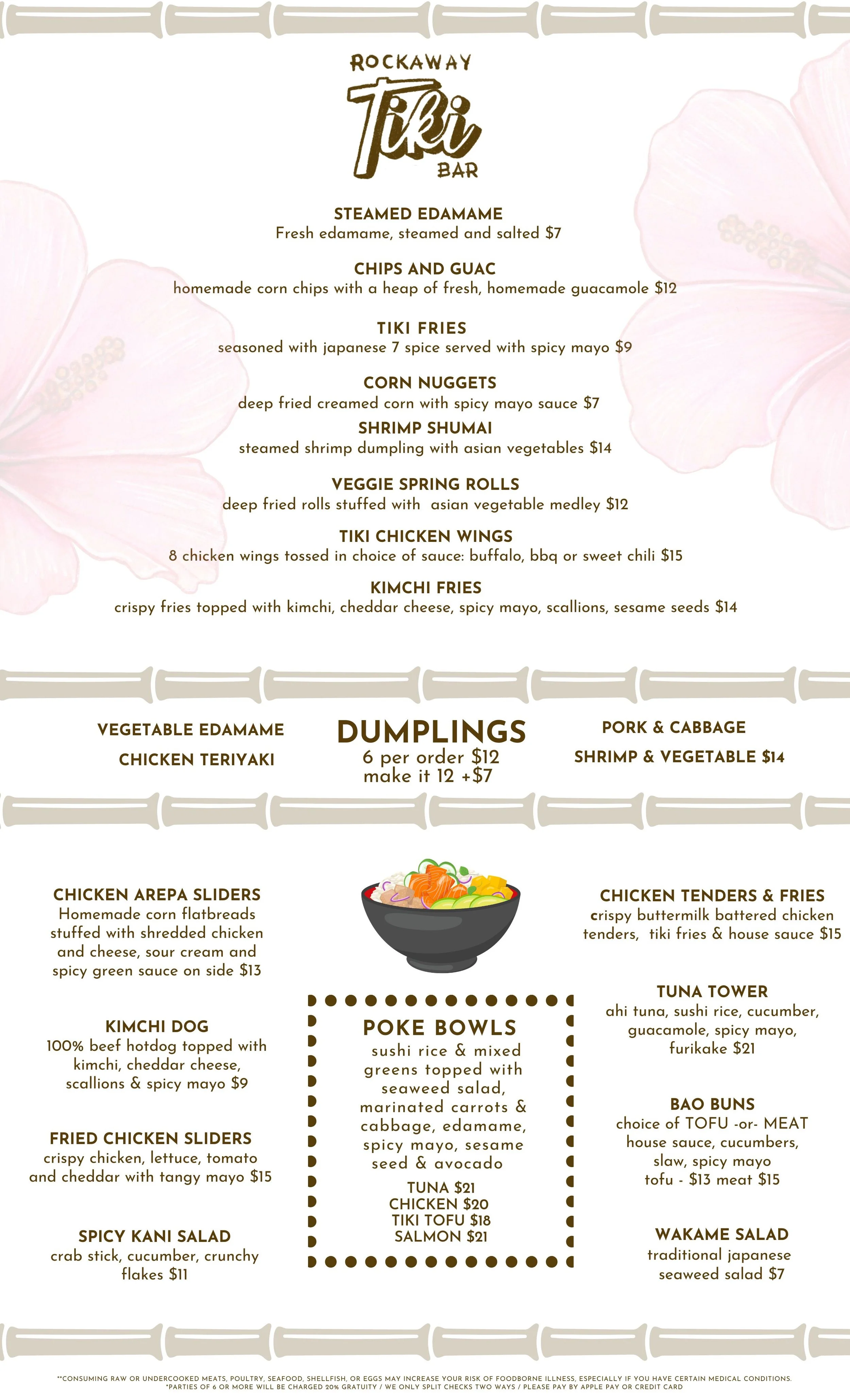 Seasonal food menu featuring our signature Hawaiian inspired dishes. Poke Bowls, Dumplings, Spring Rolls & Seasonal Specials.